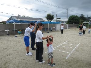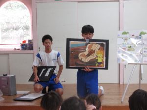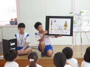 前日から生徒達には、こどもたちへの指導方法について勉強してもらい、それを披露してもらい、保育園の子供たちは、おにいちゃんたちの話に、目を輝かせて、話を聞いていました。
