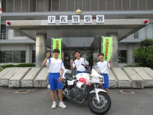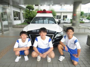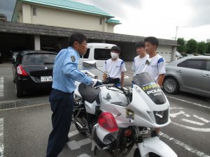 普段、馴染みのない白バイやパトカーの話などを真剣なまなざしで学生たちは聞いていました。